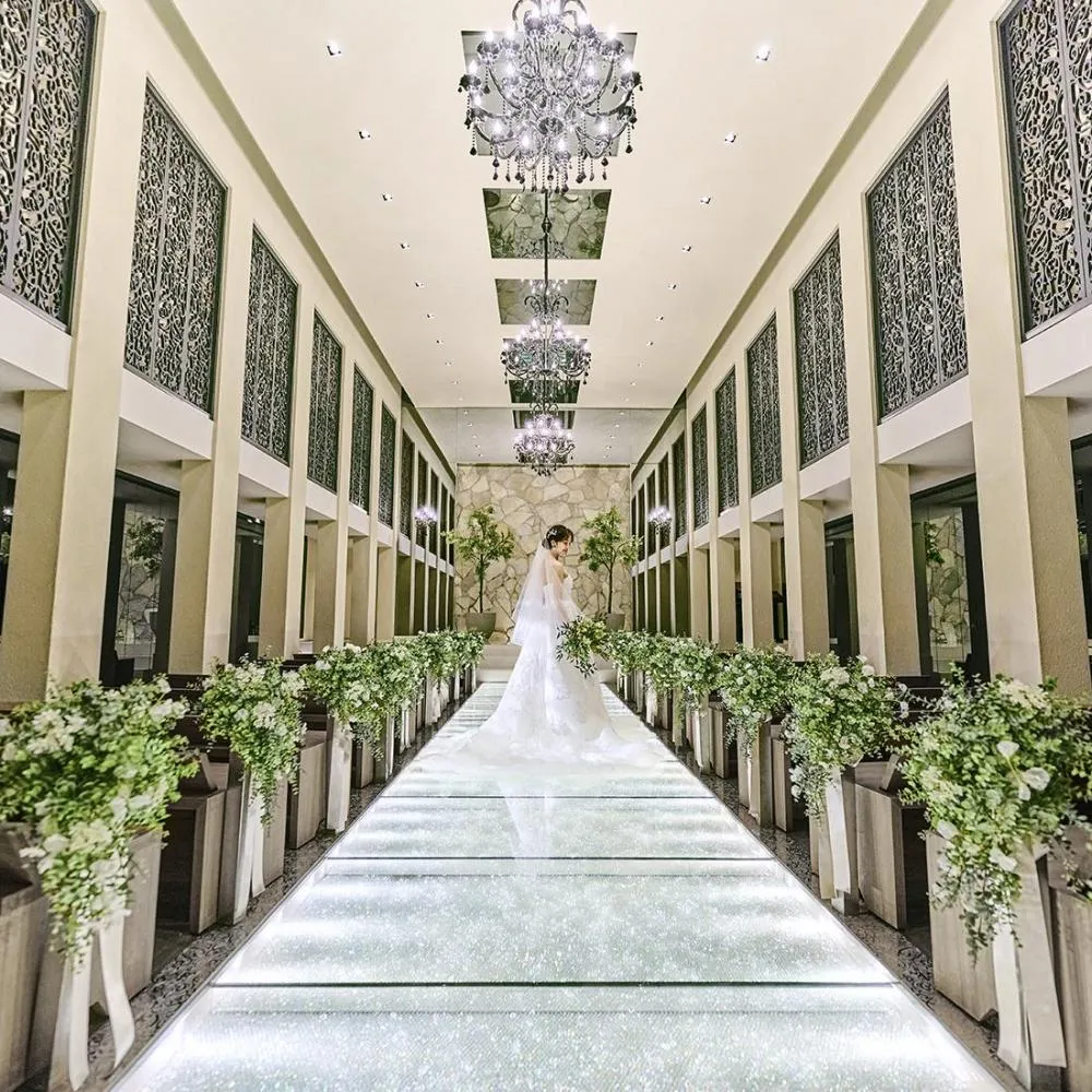 【光り輝く天空のバージンロード】ダイヤモンドを約40万個敷き詰めたチャペル。ドレス姿も映える光煌めくバージンロードを体感!大階段でのアフターセレモニー、親御様へ想いを伝える映像演出も必見です。