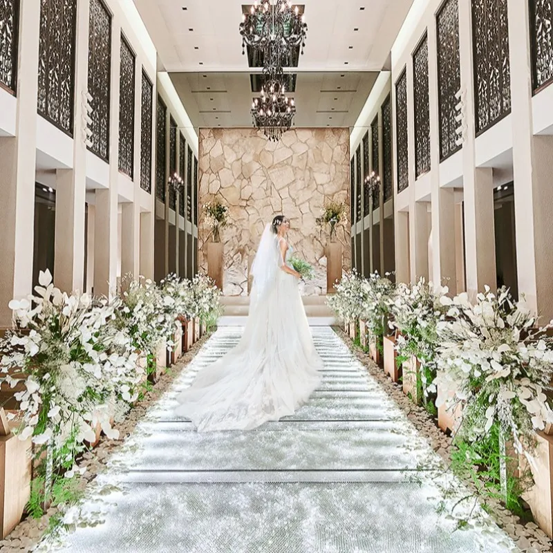 【光り輝く天空のバージンロード】ダイヤモンドを約40万個敷き詰めたチャペル。ドレス姿も映える光煌めくバージンロードを体感!大階段でのアフターセレモニー、親御様へ想いを伝える映像演出も必見です。